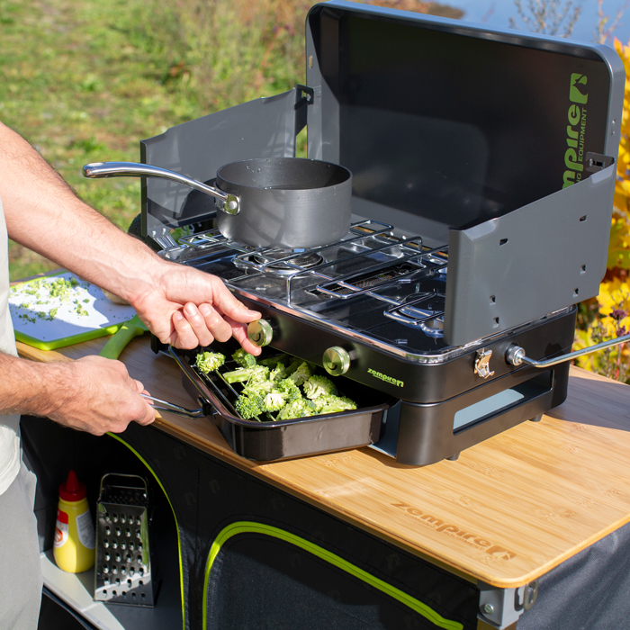 - Wrap around wind shields Provides all-round wind protection for both burners keeping temperatures consistent.