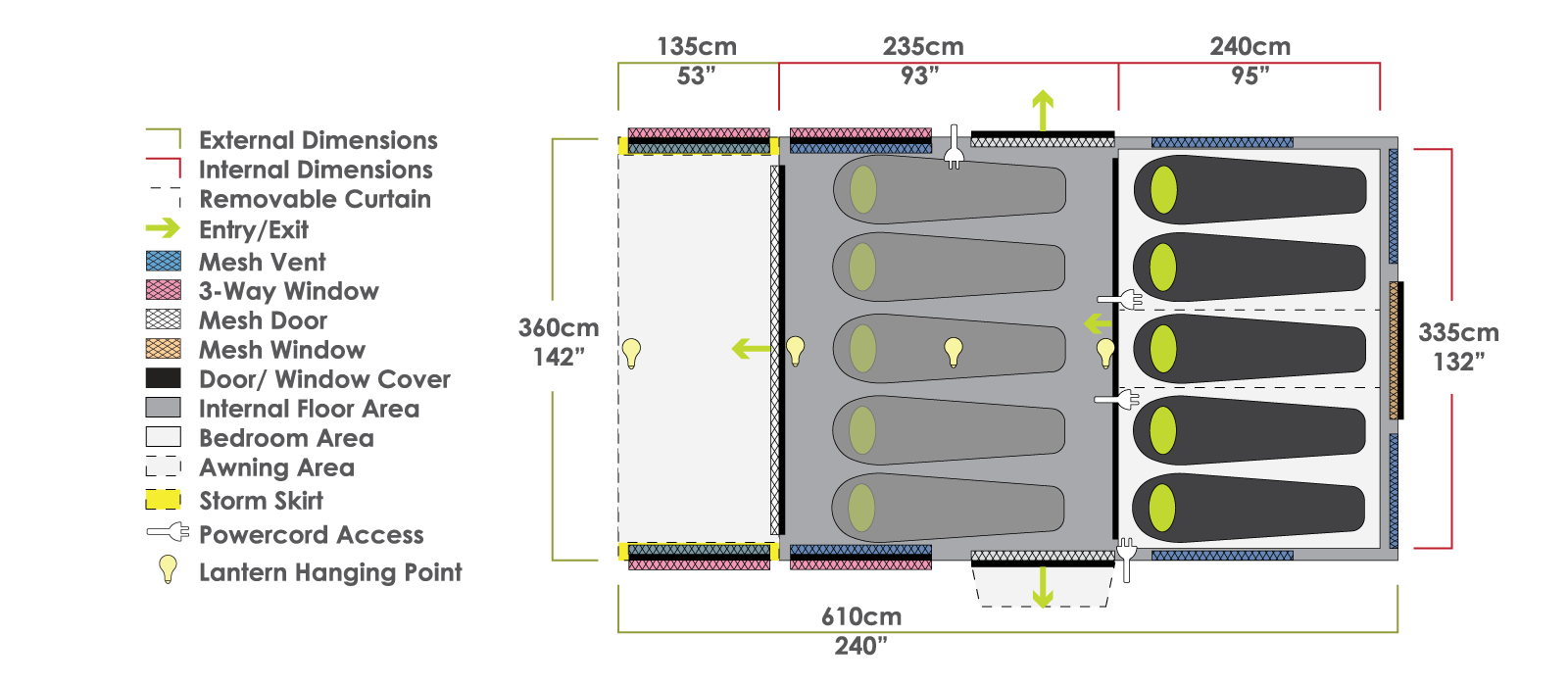- All weather access Vital covered space to remove wet weather gear or brush off the dirt or sand prior to entering the internal sleeping area.