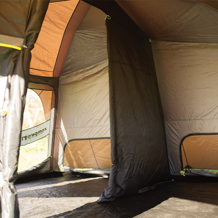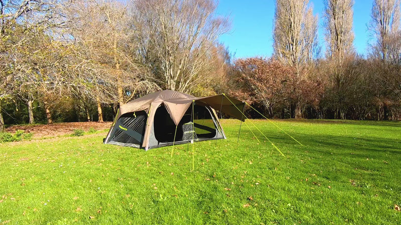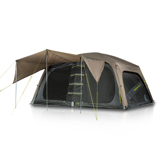 The Pronto 10 V2 is the perfect option for families on the move who want the luxury of a large tent, a smaller pack size and exceptional ventilation for warmer climates. The Pronto 10 V2 can sleep up to 10 campers and the inflatable airframe can be pumped up in under 1 minute! This huge open plan tent can be fully set-up with ease in under 10 minutes. A zip-out curtain with twin front entry doors allows you to divide the internal space into two rooms and the gull wing awning provides extra shade & outdoor living space.