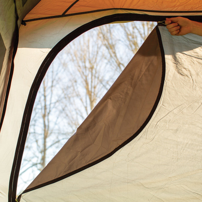 • It is important that lower vents are opened at all times to reduce condensation. During humid or damp conditions, it is recommended that the waterproof door covers are opened to expose the mesh layer, enabling additional airflow throughout your tent.